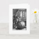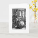Eine Vintage Abbildung einer Frau, die durch das Licht des Fensters sitzt und gestrickt, während ein Mann hinter ihr zusieht. Die Karte ist leer für Ihre handgeschriebene Nachricht.
