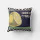 Das Vintage Look-throw-Kissen verfügt über eine französische Lemon Syrup-Werbung / Label "Sirop de citron" mit zusätzlicher Schachbrettabdeckung.