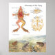Wandkarte der Anatomie des Frosches. Zeigt die inneren Organe und das Skelettsystem an. Nah mit seitlicher Sicht auf den Schädel.