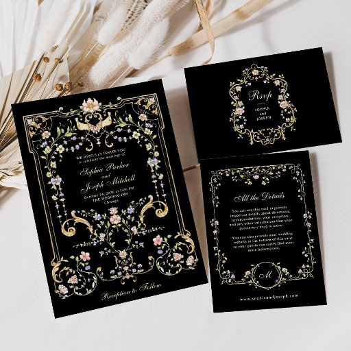 Diese atemberaubenden und wunderschönen Hochzeitsausweise sind eine einfache Möglichkeit für Ihre Gäste, alle Informationen zu Ihrer Hochzeit einzuscannen. Fügen Sie einfach Ihren QR-Code hinzu, damit Sie ihn einfach einscannen und Details über die Fahrtrichtung, Unterkünfte, Sicherheitsmaßnahmen, Empfang-Infos, Shuttleservice und vieles mehr erhalten können. Diese Einschließkarten sind im antiken Stil gehalten, in einem illustrierten Rahmen im Barockstil, der mit farbenfrohen Blume und Blätter in dezenten Pfirsichfarben, Rosa, lila, Grün und Neutronen auf dunklem, schwarzem Hintergrund dekoriert ist. Ein skurriler Look, der sich auch an den Jugendstil oder die Eleganz der Art Nouveau erinnert. Elegante Kalligraphie und klassisch grauer Text ergänzen das luxuriöse botanische Design.