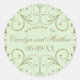 Dekorative Wirbel und Schnörkel umrahmen dieses elegante, Vintage, inspirierte Gastgeschenk Hochzeit Aufkleber-Design. Helles Pistaziengrün und antikes Gold. Personalisieren Sie den benutzerdefinierten Text mit einem Monogramm der Braut- und Bräutigam-Namen und Hochzeitstermin.