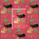 Ein hellgrüner und blauer Kolibri thront auf einer tropischen Rebsorte mit hellrosa Blume. Auf einem mittelrosa Hintergrund angezeigt, wählen Sie "Anpassen", um die Hintergrundfarbe zu ändern.
