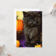 Karte mit einem Vintagen Halloween Kätzchen! Eine flauschige schwarze Pose neben Kürbissen vor einem lila Hintergrund. Ein Geschenk für Halloween-Partys und Katzenliebhaber!