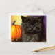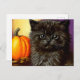 Postkarte mit einem Vintagen Halloween Kätzchen! Eine flauschige schwarze Pose neben Kürbissen vor einem lila Hintergrund. Ein Geschenk für Halloween-Partys und Katzenliebhaber!