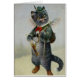 Vintage Grafik durch Arthur Thiele kennzeichnet eine fesche schauende Katze, die draußen für einen Tag des Abenteuers gekleidet wird. Er trägt einen grünen Hut mit einer Feder im Hutband und in den starken wandernden Stiefeln. Ein Stock ist im Haken seines Armes, hat er Ferngläser, um seinen Hals und einen Rucksack auf seinem zurück zu hängen. Er trägt ein Beben der Pfeile und des Bogens eines Bogenschützen, und Sie bemerken die Gazeflügel auf seinen Schultern. Eine Amorkatze? Der deutsche Künstler, Karl Robert Arthur Thiele (1860-1936) ging allgemein durch den Namensarthur Thiele. Er war ein Illustrator der Bücher, der Noten und der Postkarten. Er war für seine komischen anthropomorphen Tiere berühmt, die in der Kleidung gekleidet wurden und in den menschlich ähnlichen Szenen dargestellt waren. Dackeln waren ein Lieblingsthema von seinem. Zusätzlich zu den Tieren andere Themen war er illustriert Sportpostkarten, das Gemüse, das zum Leben, Snowmen geholt wurde und badete Schönheiten und Propagandapostkarten der Ära WW1. Das Internet ist von den Hinweisen voll, die Karl Robert Arthur Thiele mit einem anderen deutschen Maler seiner Zeit verwechseln, die Julius Arthur Thiele genannt wird, der Landschaften malte. Sie sind nicht der gleiche Künstler. Diese Karte ist leeres Innere für Ihre eigene Mitteilung.