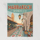 Diese Postkarte zeigt eine lebendige, Vintage Illustration eines belebten Souks oder einer Marktstraße in Marrakesch, Marokko. Es zeigt eine lebhafte Szene mit komplizierten Fliesenmustern auf dem Boden, Laternen, Markthallen mit bunten Waren und traditionelle Architektur einschließlich eines entfernten Turms. Der Text "MARRAKECH MOROCCO" ist vertikal auf der rechten Seite der Postkarte geschrieben.