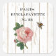 Shabby Chic-Aufkleber sind mit einem Vintagen Paris-Adressenschild, einer Vintagen rosa Rose und einem schwindenden Honigbiene auf einem holzgeschüttelten Hintergrund versehen.