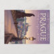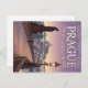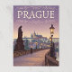 Auf dieser Postkarte finden Sie eine wunderschöne Vintage Abbildung von Prag, Tschechien, die die berühmte Karlsbrücke bei Sonnenuntergang oder bei Sonnenuntergang zeigt. Die Pflastersteine und Statuen der Brücke werden von warmen Straßenlaternen beleuchtet, und die zauberhafte Skyline der Stadt ist im Hintergrund unter einem weichen, pastellfarbenen Himmel zu sehen. Das Wort "PRAG" wird vertikal auf der rechten Seite geschrieben, gerahmt von dekorativen Wirbel.