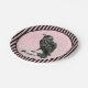 Dieses Vintage Halloween Paper Plate zeichnet sich durch ein viktorianisches rosa Damast-Design aus, mit einem Rabe in der Mitte mit schwarzen und rosa Streifen am Rand.