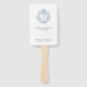 Barocke Hochzeitsfans mit verziertem blauen Wappen bieten ein luxuriöses und funktionales Detail für elegante Zeremonien. Die Vorderseite ist mit einem Rokoko-inspiriert Monogramm-Wappen mit aufwändigen Scrollarbeiten und Blumenverzierungen ausgestattet, was einen bemerkenswerten ersten Eindruck hinterlässt, der von der Eleganz der Regentschaft geprägt ist. Unten zeigen klassische Serifen und Schriftart fließender Schriften die Namen des Paares und das Hochzeitsdatum in leuchtendem Gold. Die Rückseite organisiert die Zeremonie und die Details der Hochzeitsfeier in einem sauberen, leicht lesbaren Layout, alle in passendem goldenen Text. Der dekorative Ventilator ist perfekt für Hochzeiten bei warmem Wetter und verbindet aristokratischen Charme mit praktischer Eleganz für ein zeitloses, hoteleigenes Ambiente.