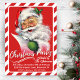 Diese Retro-Weihnachtsweihnachtsausstellung aus der Mitte des Jahrhunderts zeigt eine klassische Wiedergabe des Weihnachtsmanns, der seine Liste mit einem Augenzwinkern und einem Augenzwinkern inmitten eines gestreiften, rot-weißen Kantenrandes überprüft. Personalisieren Sie dies, indem Sie Ihre Ereignisdetails hinzufügen und eine Option wählen, um eine zusätzliche Meldung auf der Rückseite verlassen oder die Rückseite leer verlassen.