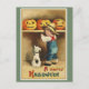 Diese Vintage Halloween-Illustration aus dem frühen 19. Jahrhundert zeigt einen kleinen Jungen, der in Oldtimerverkleidungen Jack-o-Laternen mit seinem Hund auspflückt. Die Worte "Ein glückliches Halloween" werden unten zitiert.