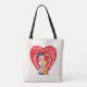 Schöne Tote-Taschen im Überdruck! Erhältlich in zwei Stilen und zwei Größen! Vintage Illustration Viktorianisch Happy Valentine's Day-Design mit einem die mit einem hübschen kleinen Jungen mit großen Augen und rosigen Wangen. Er spielt ein Musikinstrument, das Banjo. Ein süßer Welpenhund ist an seiner Seite. Ein großes rotes Herz hat den Text, ich sage es mit Musik, ich wollte dich für mein Valentin. Retro 50er kitsch. Antike Liebe und romanische Ephemerien.