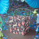 Dekorative Vintage Retro Weihnachtsmuster. Schneeflocken, Rentiere und Weihnachtsbäume auf grauem Hintergrund.