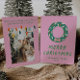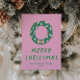 Wenn Sie eine einzigartige und schöne leicht bearbeitbare Weihnachtskarte suchen. Dieser ist perfekt für dich. Und wie Sie sehen, zeigt das Design einen handgefertigten und gezeichnet grünen Bandbogenkranz. Mit einer grünen Hand geschrieben Kalligraphie von MERRY CHRISTMAS. Und ein Grußteil im Hintergrund, zusammen mit einem anpassbaren Foto und Lichterkette. Alles Auf fett und hell rosa Hintergrund.