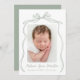 Feiern Sie Ihre kleine Ankunft mit unserer Vintagen Sage Green Bow Geburtshilfeankündigung. Zeigen Sie das Foto Ihres Neugeborenen, gerahmt durch einen zauberhaften Salbei-grünen Bogen, mit dem Namen Ihres Babys in einem hübschen handgeschriebenen Weisen-Grün-Skript. Unten können Sie Geburtsdetails wie Gewicht, Länge und Datum hinzufügen. Die Rückseite bietet Platz für ein zusätzliches Foto und eine personalisierte Botschaft an die Lieben. Dieser anpassbare Sake ist der perfekte Weg, um Ihr neuestes Familienmitglied mit Stil und Anmut bekannt zu geben!