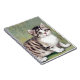 Notebook mit gestreiftem Kätzchen. Schwarze Streifen kreuzen über das Fell eines weißen Kätzchens. Eine weiße Blume schmückt einen Korb auf einem grasbewachsenen Feld. Ein fantastisches Geschenk für Katzenliebhaber und Viktorianische Kunstliebhaber!