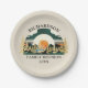 Erstellen Sie einzigartige Wiedersehen-Papier-Teller für Ihre Camping-Themenparty. Das Design besticht durch eine Vintage Sonnenuntergangslandschaft mit Bergen und Kiefernwäldern und einem See auf beigem Hintergrund. Geben Sie Ihren Familiennamen und das Jahr über die Vorlage ein, um sie zu personalisieren.