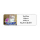 Rücksendeadressen-Aufkleber mit einem flauschigen weißen Kätzchen! Das blaue mit Augen Kätzchen sitzt in einer blauen Schüssel mit rosa Blume. Eine lila geblümte Decke ist vorne drapiert. Ein wunderbares Geschenk für Katzenliebhaber und Viktorianische Kunstliebhaber!