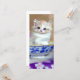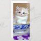 Karte mit einem flauschigen weißen Kätzchen! Das blaue mit Augen Kätzchen sitzt in einer blauen Schüssel mit rosa Blume. Eine lila geblümte Decke ist vorne drapiert. Ein wunderbares Geschenk für Katzenliebhaber und Viktorianische Kunstliebhaber!