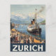 Dieses Vintage Reiseplakat vereint die Eleganz Zürichs. Das Design besticht durch eine lebhafte Hafenlandschaft mit einem großen Dampfschiff, einem geschäftigen Treiben am Dock und einer atemberaubenden Kulisse schneebedeckter Berge und einem klaren, blauen See. Der Kunststil mit seiner detaillierten Illustration und dem klassischen Ambiente erinnert an das goldene Zeitalter europäischer Reisen.