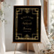 This elegant vintage-inspired wedding welcome poster features gold-colored text on a black background, framed by a rectangular geometric art deco border.
