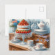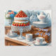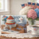 This vintage-inspired postcard captures the essence of a nostalgic 4th of July celebration. The watercolor illustration depicts a charming wooden buffet, beautifully set with a delectable strawberry cake as the centerpiece. A vase filled with miniature USA flags adds a patriotic touch, complemented by desert-inspired color palettes. Delicate red, white, and blue floral coffee pots and cups with saucers enhance the elegant ambiance, evoking a love for a classic coffee station and the timeless charm of vintage 4th of July festivities. Ai watercolor design by Susang6