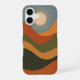 Retro illustration of an abstract landscape featuring gentle hills and a circular sun in an earthy palette.