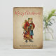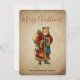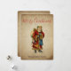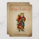 Eine flache Weihnachtskarte mit einem Vintagen Weihnachtsmann aus der Alten Welt. Klassische alte Welt santa, mit seinem berühmten roten Mantel und einer Tasche voller Spielzeuge. Dieser altmodische Weihnachtsmann ist schlank und hält einen Gehstock, um durch das Land zu reisen und allen Mädchen und Jungen Spielzeuge zu schenken. Alter Pergamentstil.