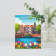 Eine wunderschöne Amsterdamer Postkarte mit den charakteristischen Kanalhäusern, Tulpen und Brücken der Stadt in einer bunten Vintagen Abbildung. Ein perfekter Sake für Reisende, Sammler oder alle, die den Charme der Niederlande Lieben.
