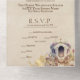 Diese Vintage inspirierte Hochzeitseinladung zeichnet sich durch ein durchgängiges Design aus, das mit einer am Ende enthaltenen R.S.V.P.-Karte versehen ist. Hier finden Sie ein romantisches Märchengeschichten-Thema. Der Hintergrund ist ein rustikales Pergamentpapier-Design mit Aquarellbildern im Stil der Märchenbilder. Im Inneren befindet sich eine antike Uhr, die oben abgebildet ist, und unten eine fürstliche Kutsche. Die Bilder sind mit goldenen Farbmustern versehen. Die klassische Phrase "einmal auf einmal" wird über dem Text in einem goldenen Glitzer-Design gedruckt.