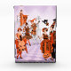 This striking vintage Art Deco illustration captures a lively 1920s Halloween celebration, featuring elegantly dressed figures in festive orange and black costumes. With playful details like jack-o’-lanterns, black cats, harlequin patterns, and musical performers, the scene evokes the glamour and whimsy of early 20th-century holiday fashion. Set against a soft lavender Art Deco–inspired background, this artwork blends spooky charm with timeless elegance—perfect for seasonal décor or year-round vintage art lovers.