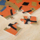 Vintage Illustration Art Deko Jazz pochoir Muster von Serge Gladky aus Fleurs, Ausgaben "Synth" Paris, 1929. Pochoir ist eine Schablonentechnik, die in surrealistischen Malereien üblich ist. Ein modernes Naturdesign mit goldenen Vögeln mit blauen Details auf einem hellen orangen und schwarzen geometrischen Hintergrund.