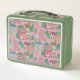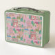 Features original LALATOWN artwork with a pink sky scene printed on a green vintage-style lunch box.
