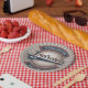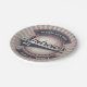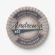 Baseball Paper Plate verfügt über eine Vintage Baseball-Illustration, die mit Namen versehen ist und durch einen Swash unterstrichen wird. Dieses Design umfasst Elemente wie Blau, Rot, Baseball, Banner und Sternexplosion. Vorlage für persönliche Anpassung, einschließlich Alter- oder Spielernummer und Veranstaltungsdatum.