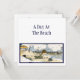 Eine individuelle Einladung mit einer Vintagen Abbildung aus einem Geschichtenbuch eines Kindes, das auf dem Sand am Strand liegt. Sein Hund schwimmt weit draußen in den Wellen.