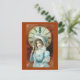 Liebliches Vintage-Bild einer jungen Dame, schön in hellblau und weiß gekleidet und mit einem Glas Champagner. Hinter ihr steht eine große Uhr, die die wichtige Stunde Mitternacht zeigt. Die Kartenmeldung lautet "Beste Neujahrswünsche".