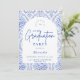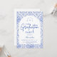 An elegant graduation celebration design featuring a delicate blue toile floral border inspired by classic European porcelain and vintage botanical prints. The intricate florals frame a clean arched center panel, creating a refined and timeless composition that highlights the graduate’s name and event details beautifully. Soft blue tones against a crisp ivory background give the design a sophisticated yet celebratory feel. Perfect for a stylish graduation gathering with a classic, romantic aesthetic.