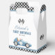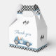 These fun birthday party favor boxes feature a vintage blue race car and chequered flags. Personalized with your birthday party details and thank yo message on the reverse. Designed by Thisisnotme©