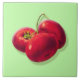 Keramik Kachel in einer Vintagen botanischen Abbildung von drei roten reifen Tomaten (Solanum Lycopersicum), digital verstärkt und farbig, auf einem hellergrünen Hintergrund