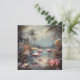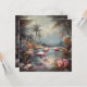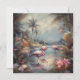 botanisches Gemälde mit Flamingos, stehend im Wasser, umgeben von Palmen und tropischen Blume