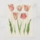 Postkarte mit einer Vintagen Abbildung von roten, rosa und weißen Tulpen aus dem Gottofer Codex, 1649-1659. Digital gereinigt und optimiert, um eine Aquarellfarbe auf einem hellen, antiken Hintergrund zu erhalten.