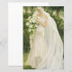 This image portrays an elegant bride standing gracefully in a lush, sunlit garden. She wears an ivory wedding gown adorned with delicate lace, subtle beading, and a softly gathered waist accentuated by a jeweled brooch. A long, translucent veil cascades behind her, catching the light and adding a sense of movement and ethereal beauty. The bride gazes gently downward at a cascading bouquet of white lilies and greenery, her expression calm and contemplative. Surrounded by dense foliage and tall trees rendered in soft, painterly tones, the scene evokes a romantic, timeless atmosphere inspired by classical illustration and Art Nouveau aesthetics.