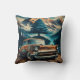 Ein Vintage-Wagen mit Blumenmotiven steht vor einer landschaftlichen Kulisse von Bergen, einem Fluss und einem üppigen Wald, der ein Gefühl von Nostalgie und natürlicher Schönheit erweckt.