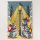 Family of mice standing under an old-style lamp post casting a golden light across them as they stand in a snowy forest scene wearing scarves and woolen hats, holding sheet music and singing carols.