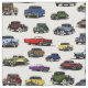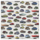Fabrik für alle, die alte Autos haben; Es zeigt ein zufälliges Muster von Illustrationen von Vintagen Autos aus dem 20. Jahrhundert.