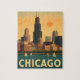 A stylized retro illustration of the Chicago skyline with sailboats on Lake Michigan under a warm, hazy sky.