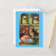 Auf dieser Urlaubskarte wird ein niedliches, Vintages Bild von drei kleinen Küken mit farbigen Eiern und Blume gezeigt. Auf der Rückseite steht: "Glückliches Ostern für dich!" Eine süße Postkarte, um Familie und Freunde zu Ostern zu schicken.