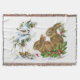 Vintage Illustrationsbüsten im Schnee mit Heiligen, Kiefern und Kiefernzapfen, und einem Vogel.