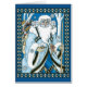 Vintage Illustration Weihnachten Weihnachtsbild des Weihnachtsmanns mit dem Nikolaus in einem blauen Mantel gekleidet, der eine Schneekugel in der einen Hand hält und in der anderen einen Stock hält. Ein Teddybär hängt an seinem Mantel, und ein Sack Spielzeug ist über seinem Rücken.